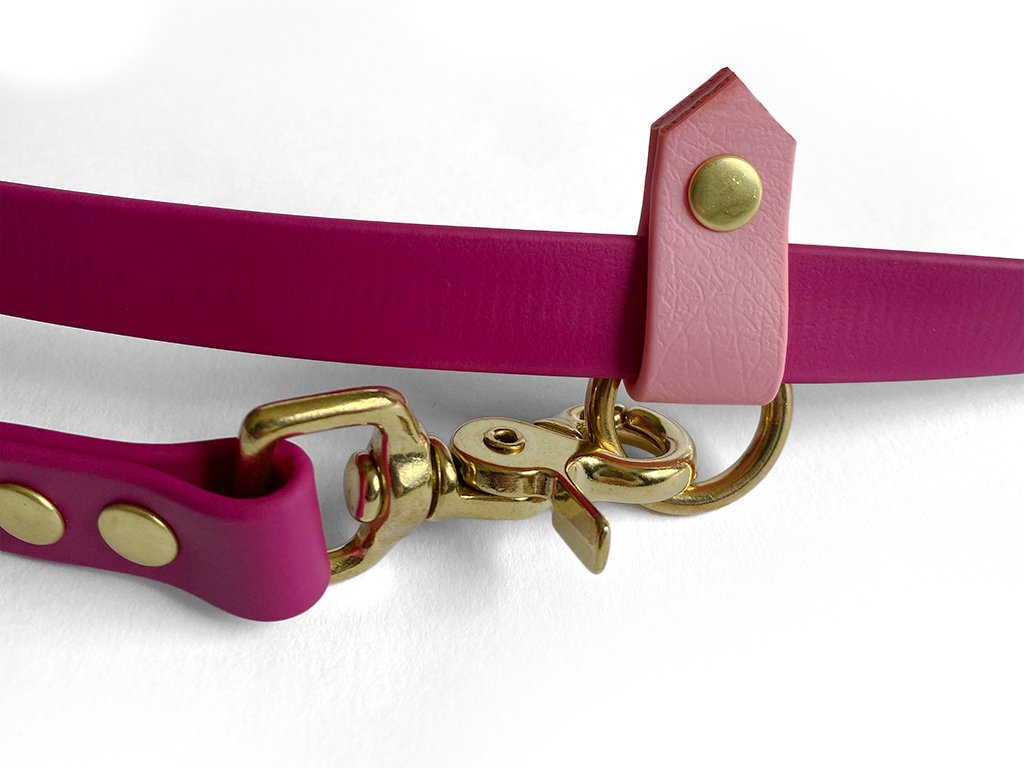 - Materiál: 1,9 cm alebo 1,6 cm široký BioThane® (skutočná farba popruhu sa môže mierne líšiť od tej na obrázku z dôvodu nastavenia vášho monitora), kovový hardware podľa vášho výberu